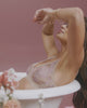 Sheer floral print high cut bikini brief in nude with lavender botanical pattern worn with matching bralette reclining in white bathtub with pink flowers and tortoise shell sunglasses