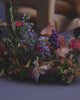 Model lounging in lavender palm tree print bralette and high-waisted briefs on pink armchair with florals
